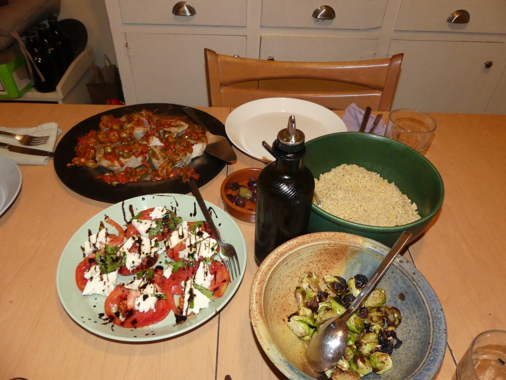 In Or what You Will, Walton expands her generous and enthusiastic celebration of books to include places she has visited (although already in My Real Children the encounter with new places plays a significant role). As with Lent, Florence is the primary setting of her latest novel. However, differing from its predecessor, the Florence of Or what You Will is divided between fantasy world of Illyria and the real-world Florence, presented briefly in 1847 and the 1970s and then more extensively in 2018. The novel is filled with beautiful evocations not only of well-known sites in the city but some that are clearly Walton’s personal favorites. When Sylvia visits Florence’s Teatro del Sale, Walton writes of it, “Talking about Teatro del Sale it’s easy to use words like ‘incredible’ and ‘unbelievable,’ but when you’re there it feels instead like the ultimate reality, the way things ought to be. Famous chefs ought to want to give things like this back to the community. Food ought to taste this way. It’s so like a wish-fulfillment narrative that it’s hard to suspend disbelief, but yet, here she is again, eating mouthwatering food, familiar but never taken for granted.” Walton’s beautiful description of the experience of Teatro del Sale has encouraged me to visit Florence as soon as I am able (in the coming after-time, of course) and to make a visit or multiple visits to Teatro del Sale among my top priorities (and in the meantime, I will to try and recreate as best I can something of the dishes she mentions. The picture below is not one of those, but a recent dinner we enjoyed here in Florida: Sicilian grilled tuna steaks with roasted Brussels sprouts, hand-rolled couscous, and Caprese salad.)